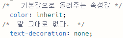 - text-decoration: none; --> 텍스트 꾸밈이 없어진다. ex) 링크의 밑줄이 사라짐