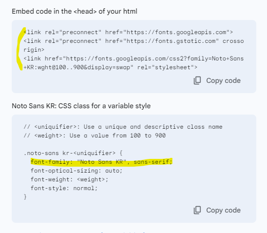 * 구글 폰트를 여러개 가져올 경우 링크 주소가 바뀔 수 있기 때문에 변경된 주소를 html에 붙여야 한다.