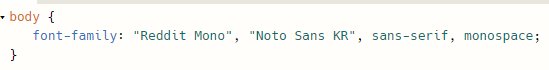 - css에 폰트가 여러개 들어있는데 적용 순서는 왼쪽의 첫 번째부터 순차적으로 적용된다.