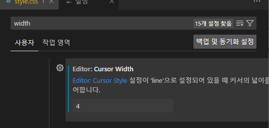 설정 창에서 'width' 검색 후 cursor width를 설정할 수 있다. 숫자가 클수록 커서바가 두껍게 나와 육안으로 쉽게 찾을 수 있다.