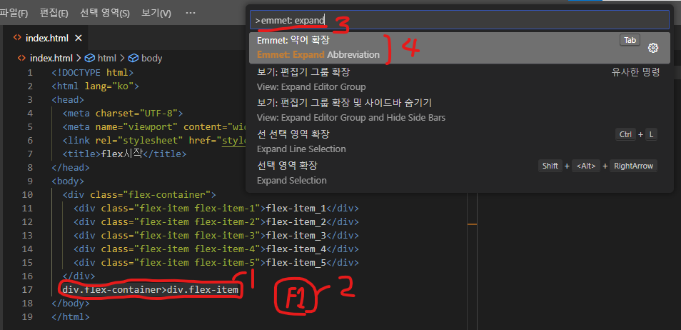 젬코딩을 선택하고 F1을 누르면 설정창이 나온다. emmet: expand...라고 검색하면 상단에 Emmit: 약어 확장이 뜬다. 선택하면 젬코딩이 바로 xml로 바뀐다.