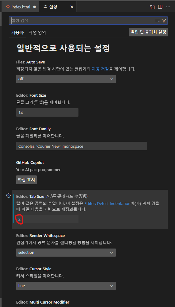 ctrl+,로 설정창을 열고 기본 공백을 2로 설정해준다.
