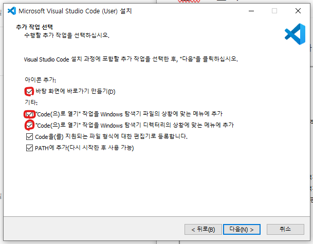 설치 시 유의할 점 - 계속 다음 누르다가 이 페이지에서 체크 안 된 박스들을 모두 체크 해줘야 이후에 폴더에서 vs code를 열 수 있다.