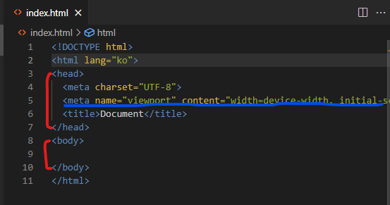 + meta 태그 중 viewport는 반응형 페이지를 만들때 반드시 필요한 라인이다.
