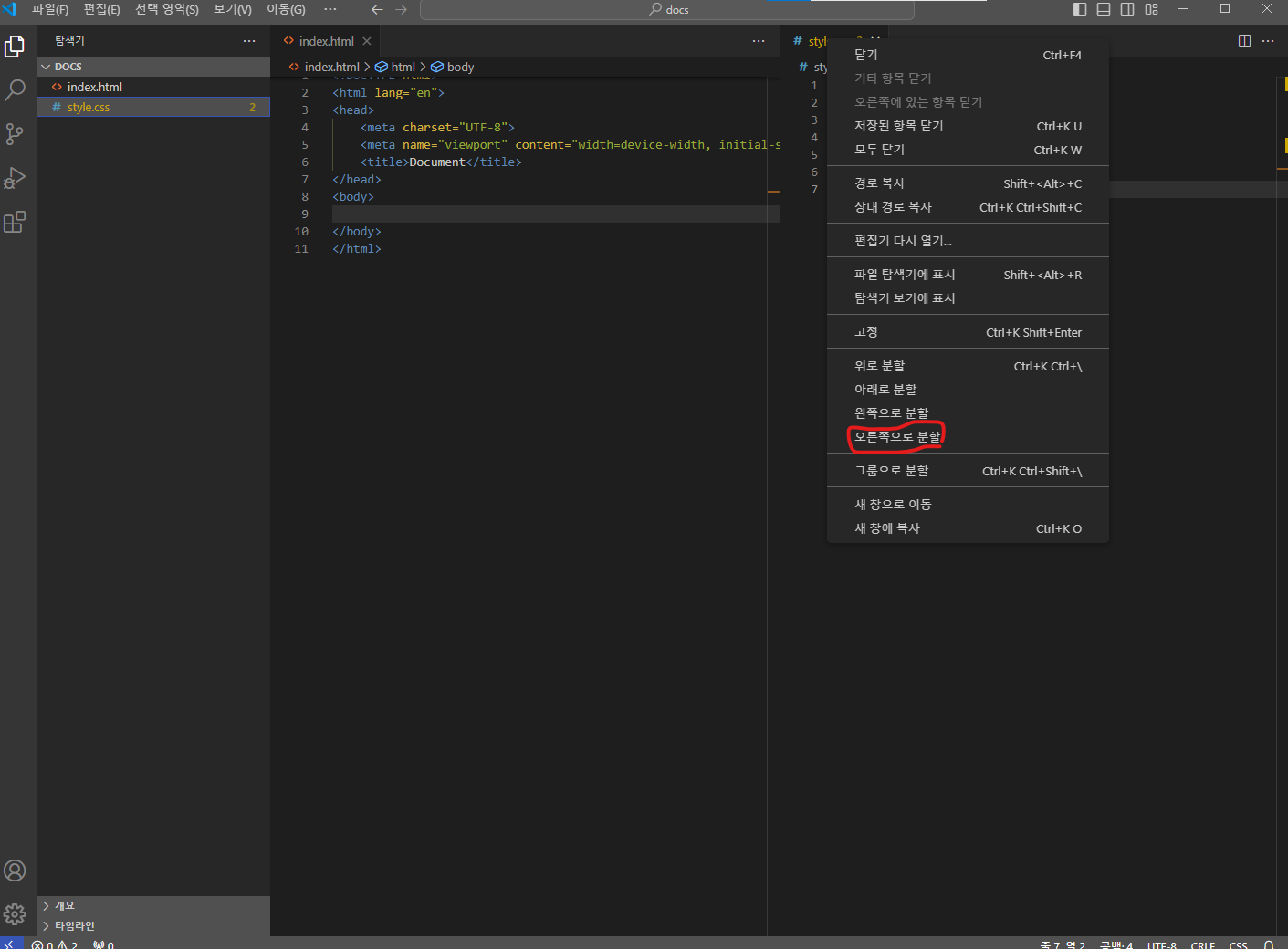여러 개의 탭을 띄울 시 일반 브라우저 탭 분리하듯 탭을 하나 클릭 후 드래그해서 커서를 오른쪽으로 가져다 대면 오른쪽에 분할이 된다. 혹은 탭위에 마우스 오른쪽을 클릭해서 원하는 방향으로 분할할 수 있다.