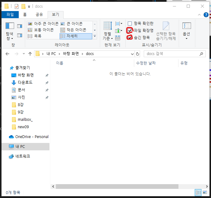 파일 확장자와 모든 파일들을 보기 위해 상단 보기>파일확장명, 숨긴 항목 체크 박스를 체크해준다.