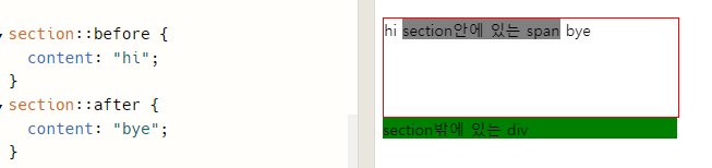 - content: "텍스트"; content 속성값이 " "안에 원하는 텍스트를 작성할 수 있다.