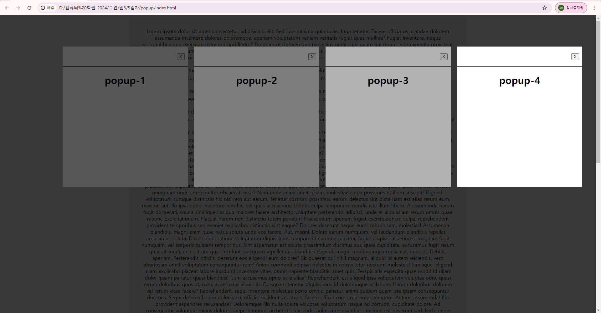 팝업의 상위엘리먼트들로의 이벤트 전파 방지도 제작해준다. => $(팝업 내부 요소).click(()=>{return false;})