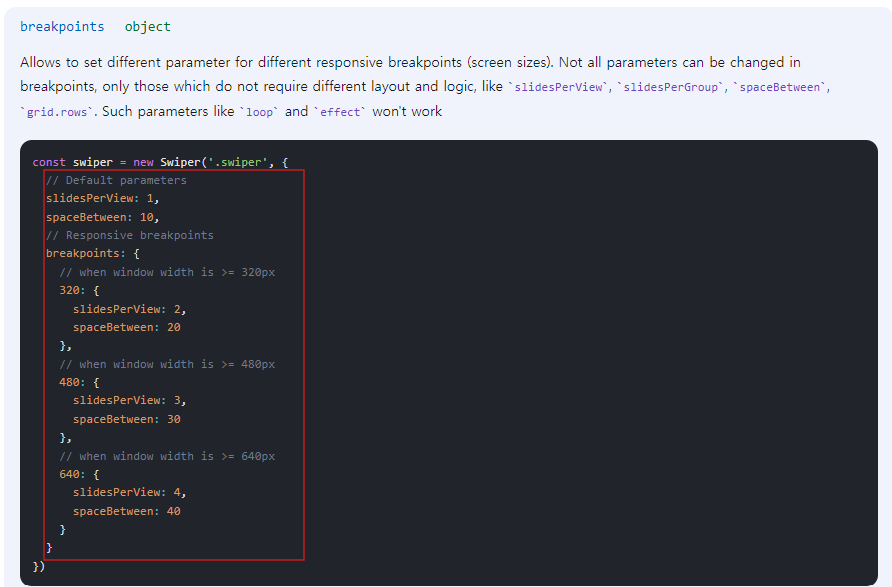 스와이퍼의 옵션에서 반응형 옵션은 'breakpoints'이다.